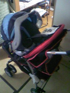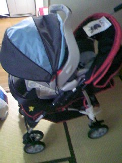 ちょっとゴツイですが、以前購入したベビーシート(青+黒)と合体できます。