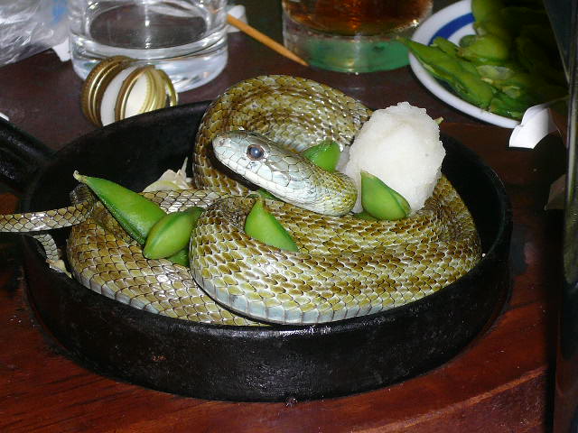 青大将の活け作り、枝前と大根おろし添え