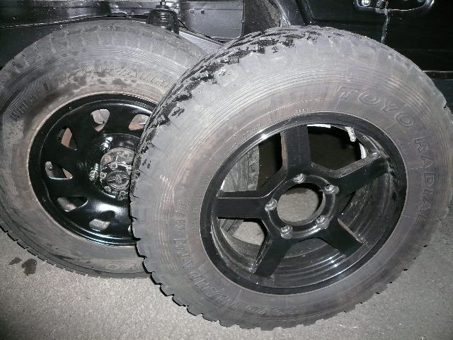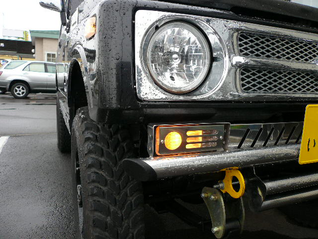 前後バンパー無し、リアゲート埋め込み丸テール、超ハミタイの細身大径タイヤ、ウォーンのウインチ、かなりの上げ具合、当然泥だらけ(笑)